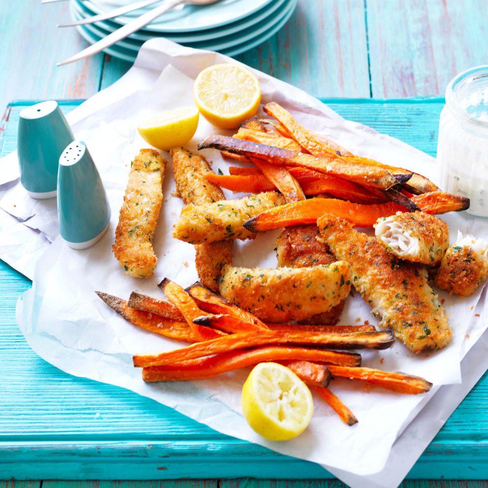 Sweet Potato Fries with Crumbed Fish