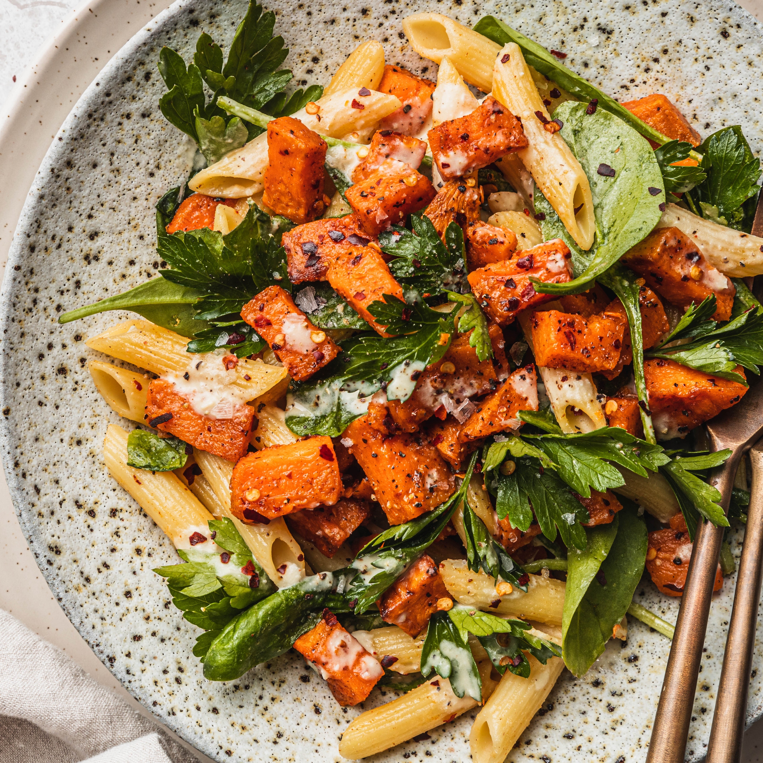 6Drain pasta and transfer to a large mixing bowl. Add the roasted sweet potato, baby spinach and tahini dressing. Toss to combine and serve.